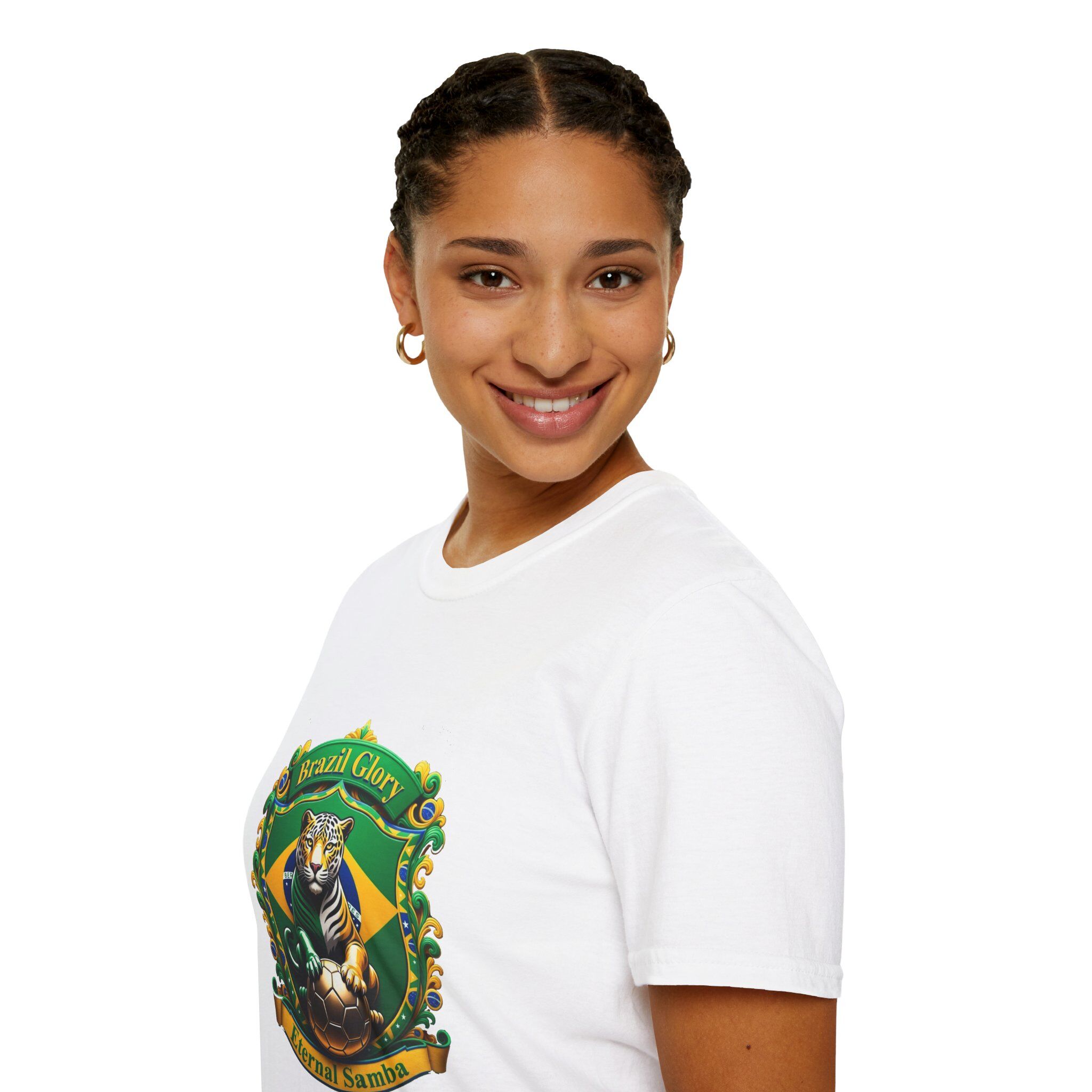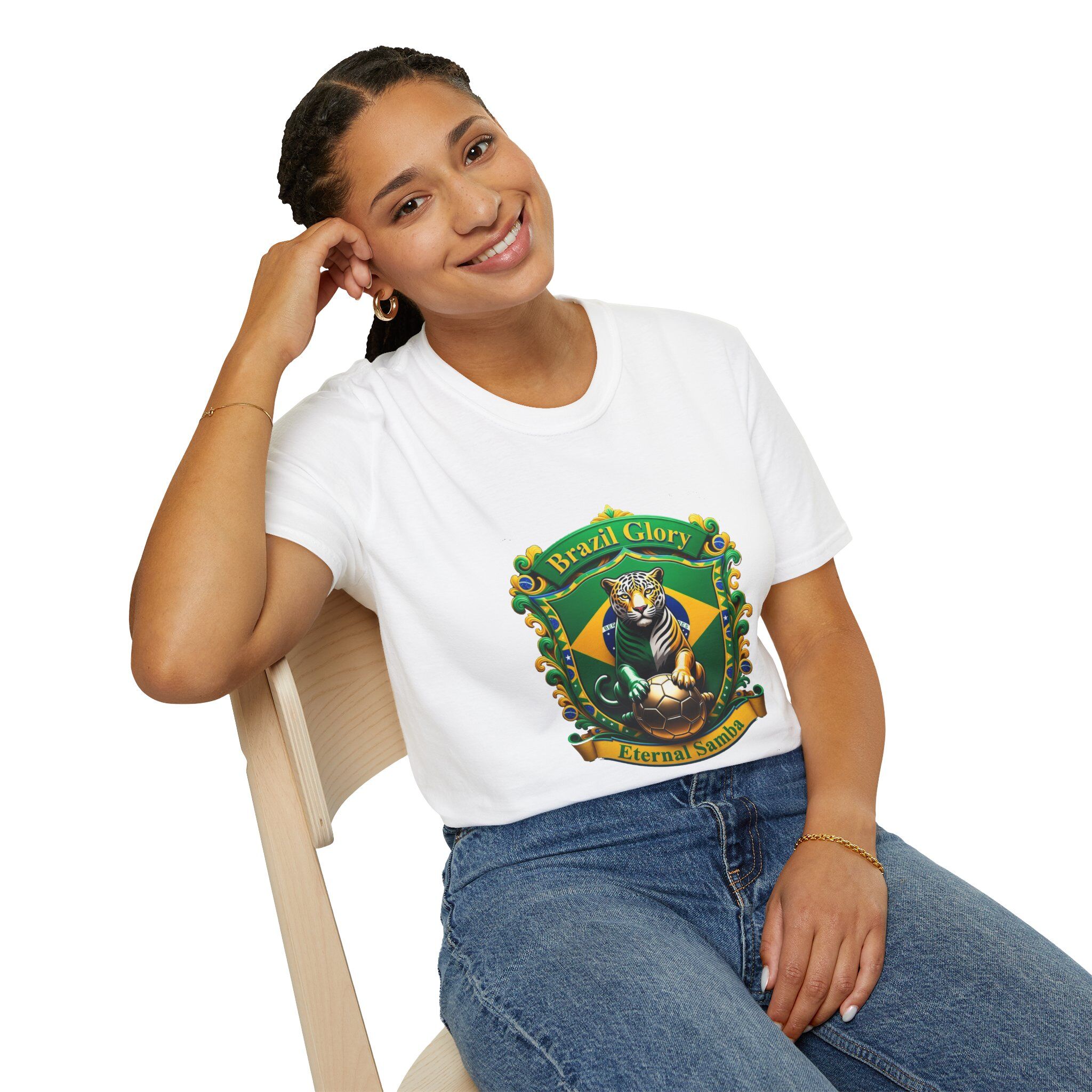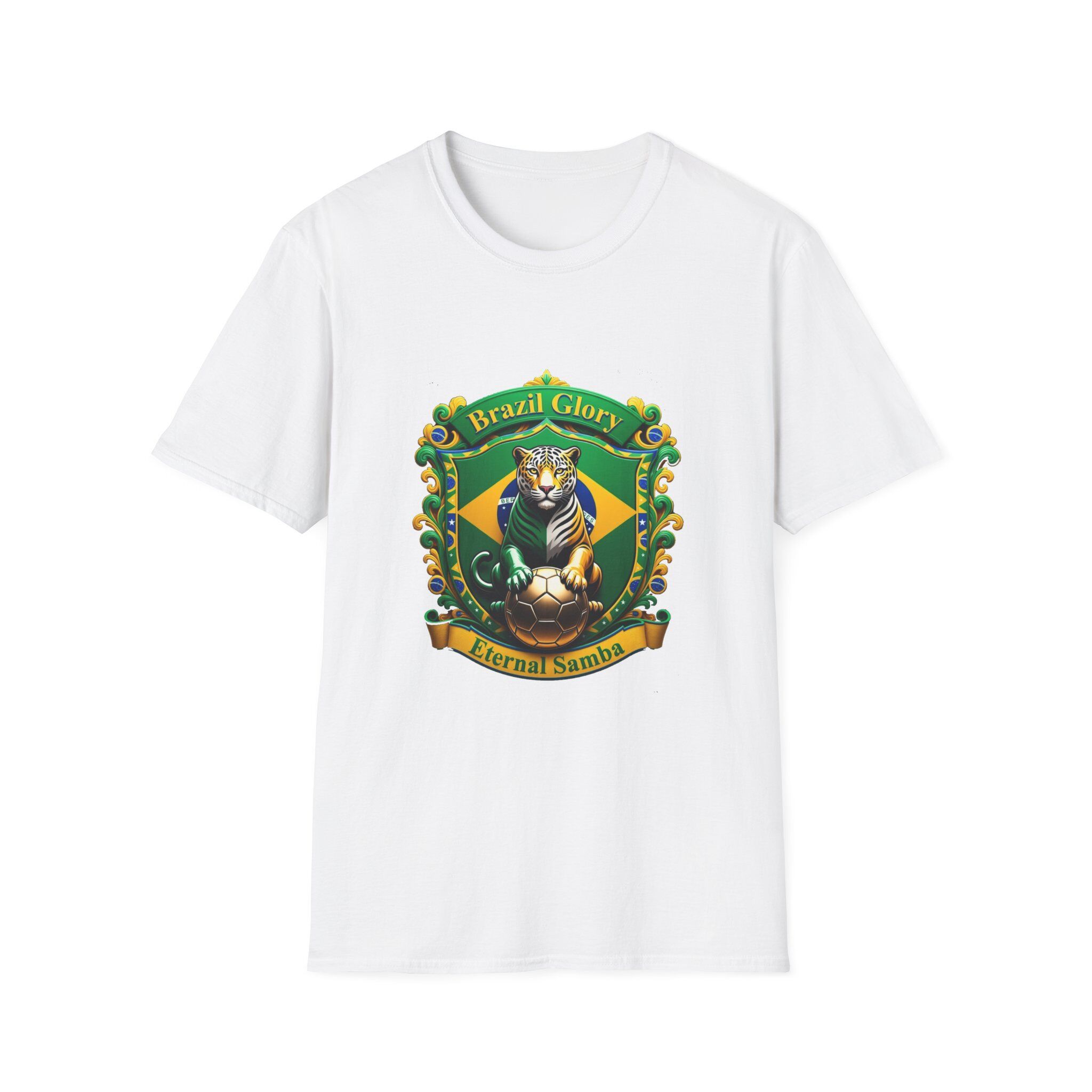 This lightweight softstyle tee carries a bold, samba-ready crest across the chest — a proud jaguar set against Brazil’s green and gold, trimmed with festive beads and a banner that reads ‘Brazil Glory / Eternal Samba’. It feels smooth and breathable on warm days, and the classic crew silhouette keeps the look clean and easy to layer under a jacket or over a long-sleeve. Wear it to street festivals, match-viewing gatherings, or casual nights when you want to show team spirit with a touch of vintage carnival flair. The single-piece knit and ribbed collar keep the shape wash after wash, while the printed label and DTF sleeve options give a finished, wearable feel. Sustainably sourced ring-spun cotton and certified safety standards mean you can celebrate responsibly.