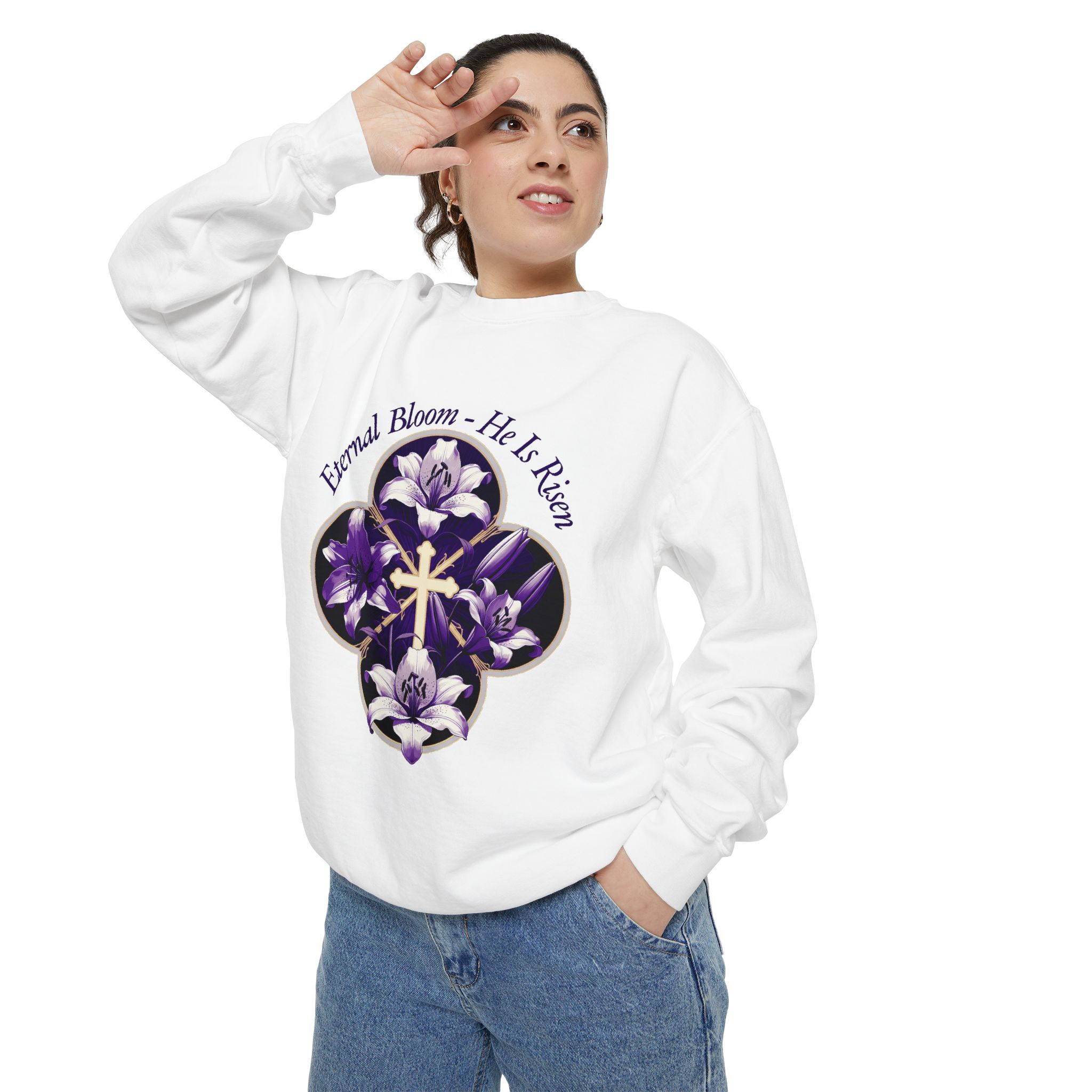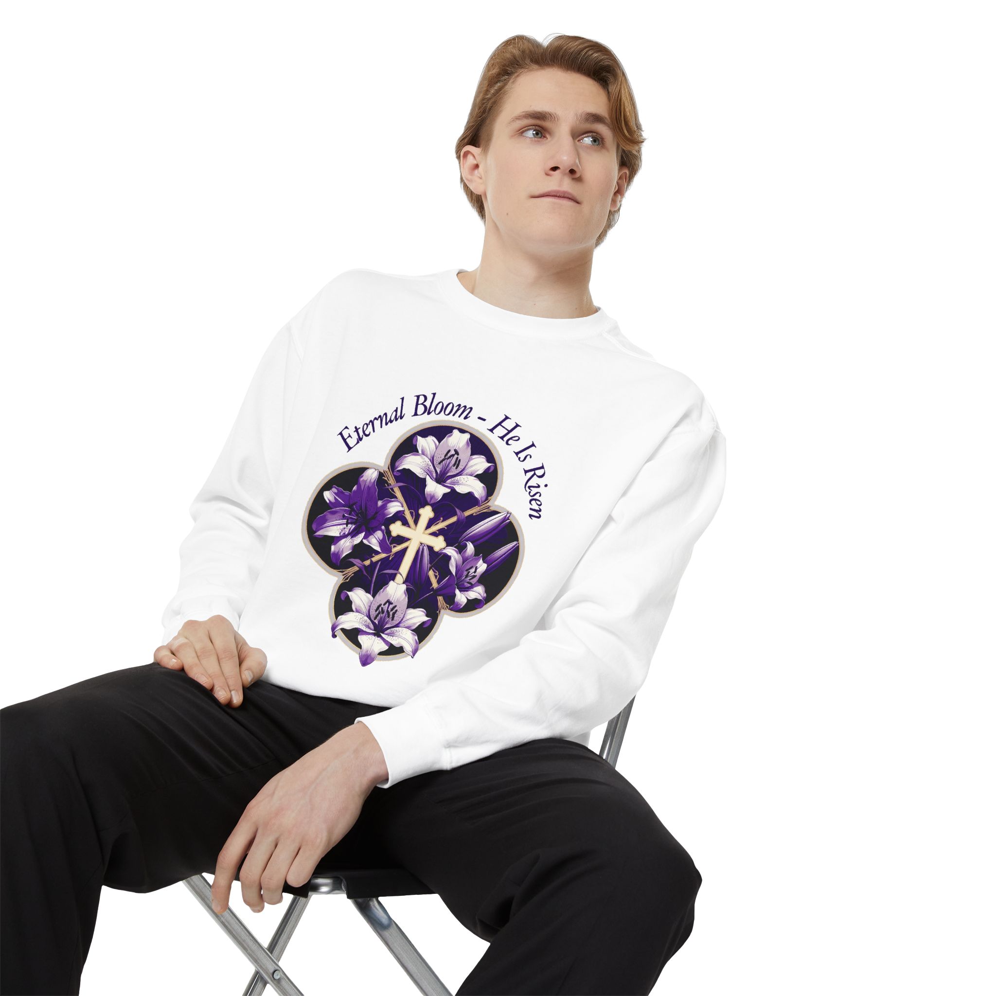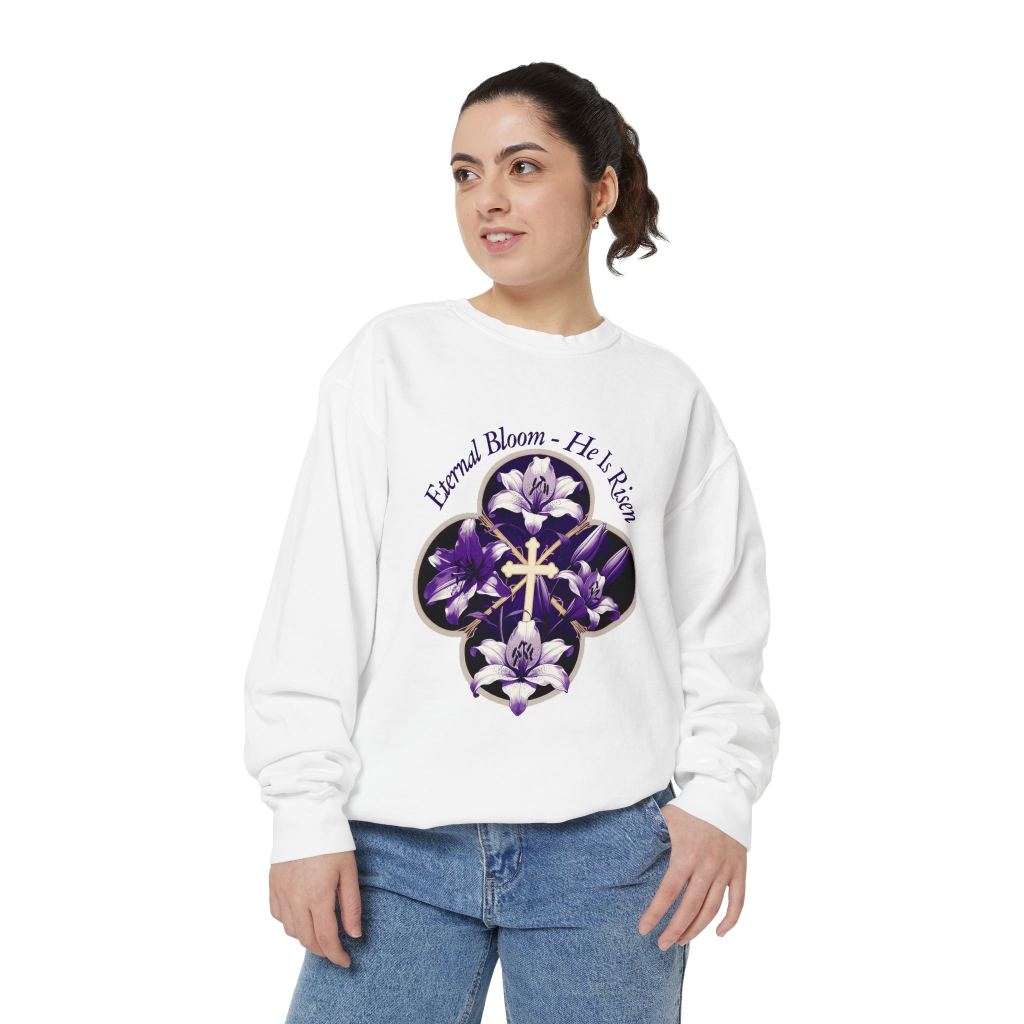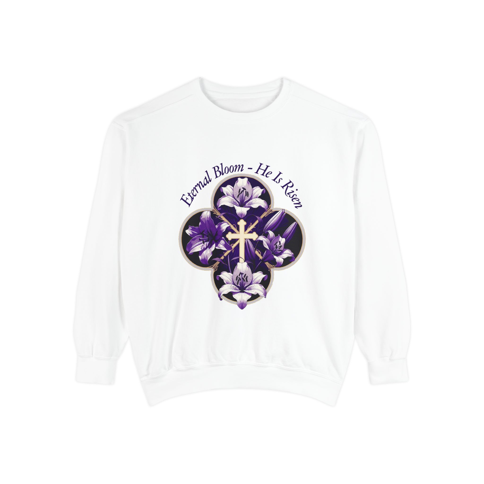 Soft, relaxed, and quietly meaningful — this garment-dyed sweatshirt wraps you in a medium-heavy cotton blend that feels lived-in from the first wear. A floral quatrefoil frames a delicate cross at the center chest, rendered in deep purple tones that read like a late-evening bouquet. The half-moon neck patch and twill neck tape give a thoughtful, durable finish while the ribbed collar, cuffs, and hem keep the shape gentle but structured. Wear it after Sunday service, on calm evenings walking home, or layered for reflective moments at small gatherings. The embroidery-ready chest areas also let you add a personal touch if you want to make it yours in a subtle, tactile way.
