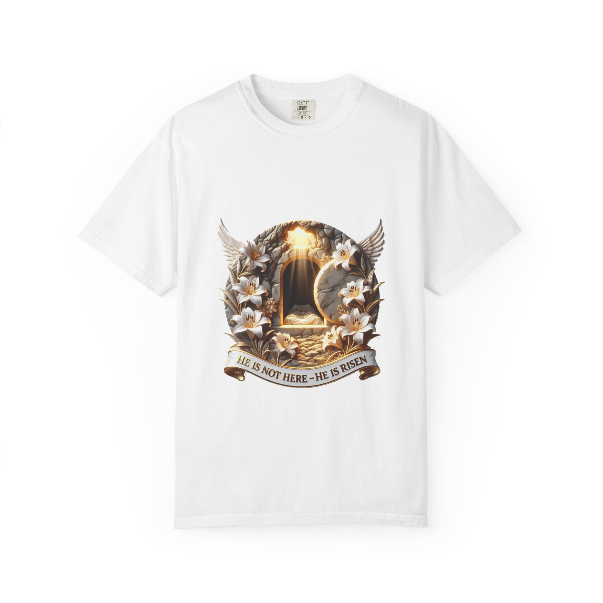 Celebrate the Resurrection with the “He Is Not Here” T-Shirt. Features an empty tomb emblem with lilies and brass highlights. Premium Easter gift by YMLux.