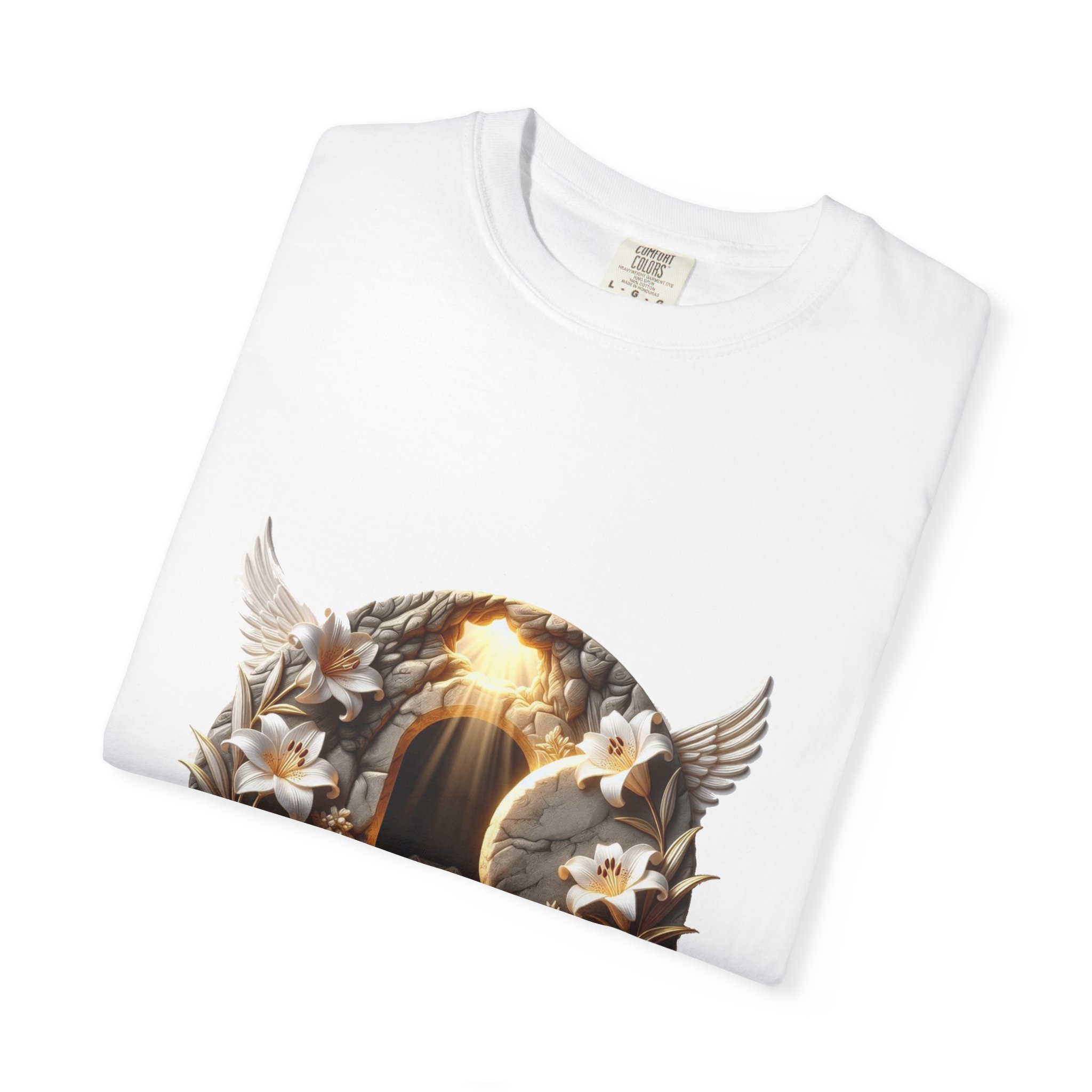 This garment-dyed tee pairs a soft, lived-in feel with a reverent, hopeful design. The artwork — a glowing empty tomb framed by lilies and wings — reads like a quiet morning of renewal. The relaxed cut and heavyweight cotton sit comfortably through volunteer mornings, church picnics, or slow reflective walks. It drapes casually over jeans or layered under a jacket, becoming something people reach for when they want clothing that feels familiar and meaningful. The subtle, washed color and sewn-in label give it a vintage, worn-in look that grows more characterful with every wash.
