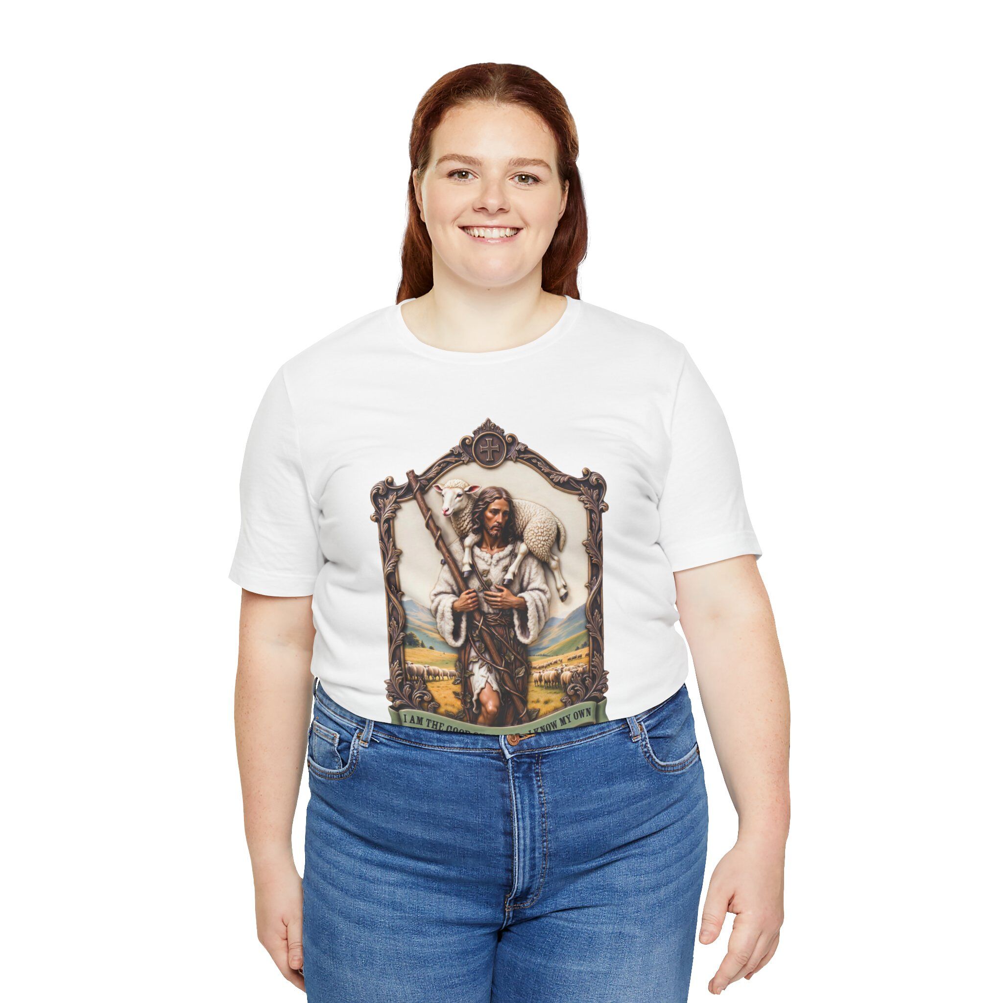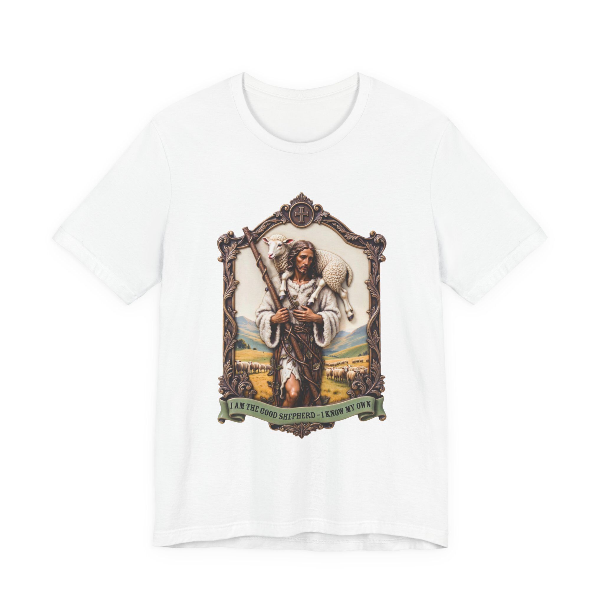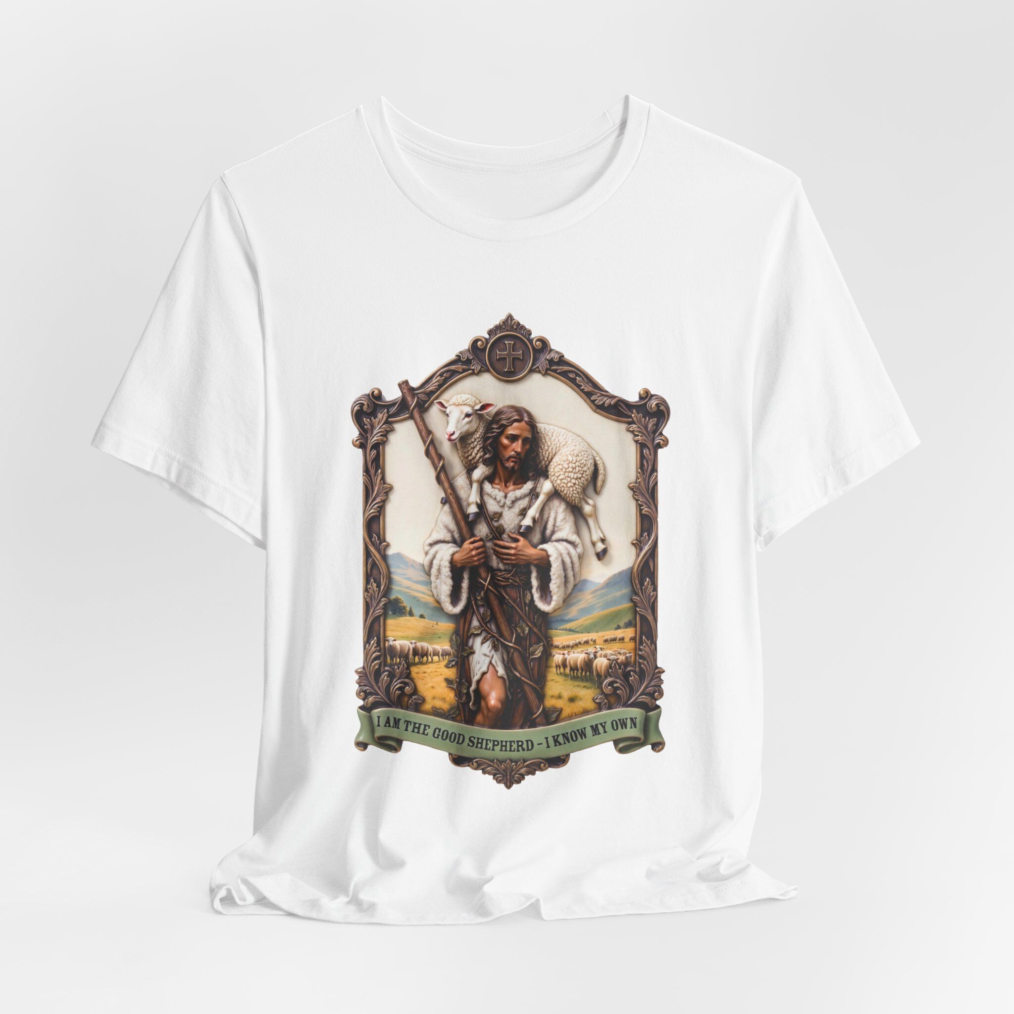 A soft, breathable tee that tells a story. This lightweight jersey shirt features a detailed, vintage-inspired illustration of a rugged shepherd carrying a staff with a lamb over his shoulder, set inside an ornate frame and grounded by a bannered motto. The artwork’s warm earth tones and fine linework give the shirt a lived-in, craft-made feel — like something picked up on a road through the countryside. Wear it on slow mornings, at local markets, on outdoor walks, or layered under a jacket when the light turns golden. It sits neatly at the hips with a classic crew neckline and holds its shape wash after wash, so the image remains the centerpiece of your everyday outfit.