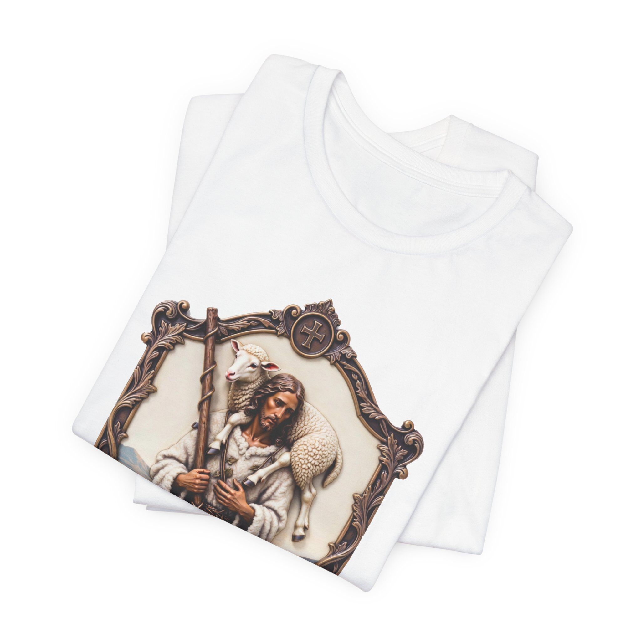 Experience the peace of the 23rd Psalm with this luxurious “Good Shepherd” crest. This premium design features a stunning, intricate portrayal of Jesus as the protector, carrying a lost lamb gently on His shoulders. The artwork is rich with symbolic detail, from the textured wool of the flock to the pastoral vines that weave gracefully around the shepherd’s staff.