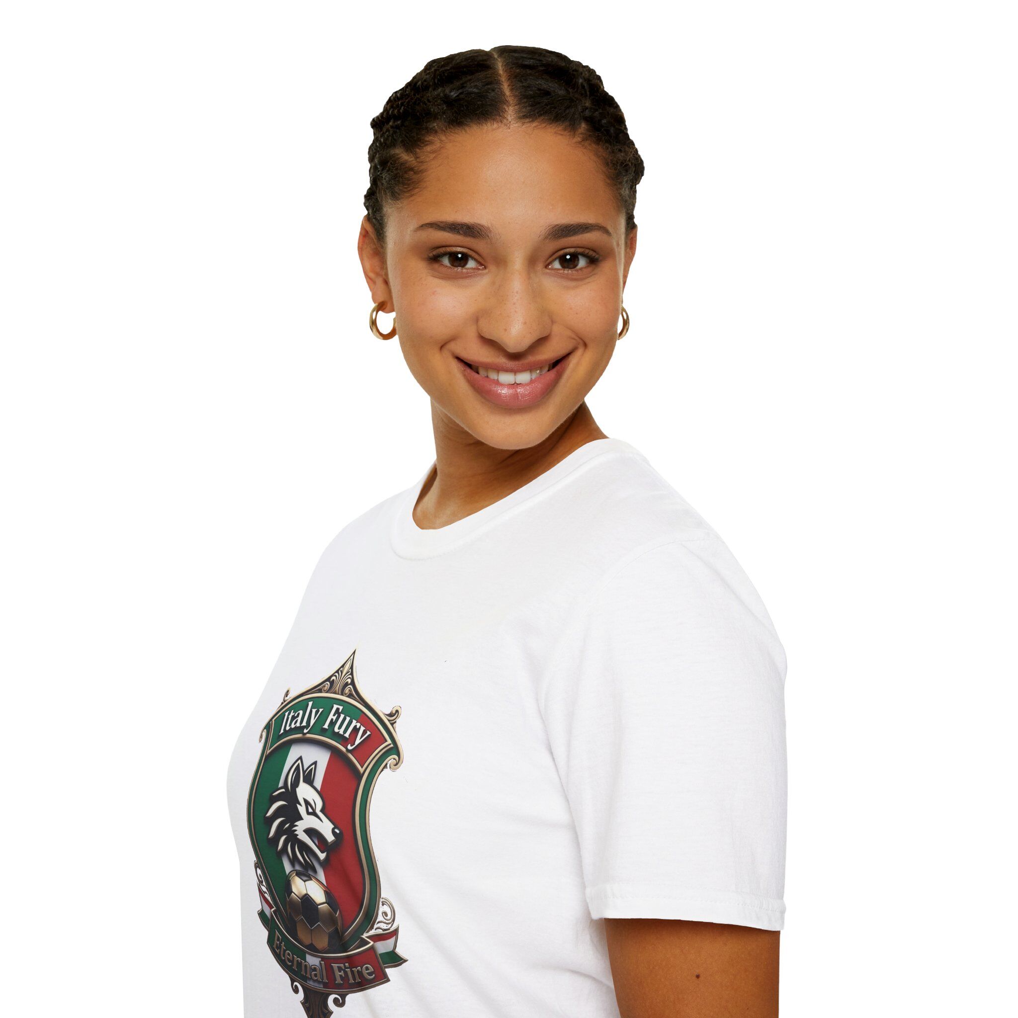 Italy’s fury is eternal—honor timeless passion and legacy with this elevated football crest. The pointed-base heraldic shield centers a proud standing forward-facing wolf rendered in solid blocks of green, white, and red from the Italian flag, framed by a large centered tricolor flag bands backdrop. Golden metallic soccer ball rests in paws with refined detail. Ornate filigree border fully themed in green/white/red flag stripes and accents; elegant top curved banner “Italy Fury” in white-on-green with red edges, bottom ribbon “Eternal Fire” in gold-on-red with green/white stripes. Sharp hard edges, high-contrast, classic non-metallic football emblem aesthetic—flag colors only + subtle gold accents for heritage national badge distinction on neutral light gray preview.