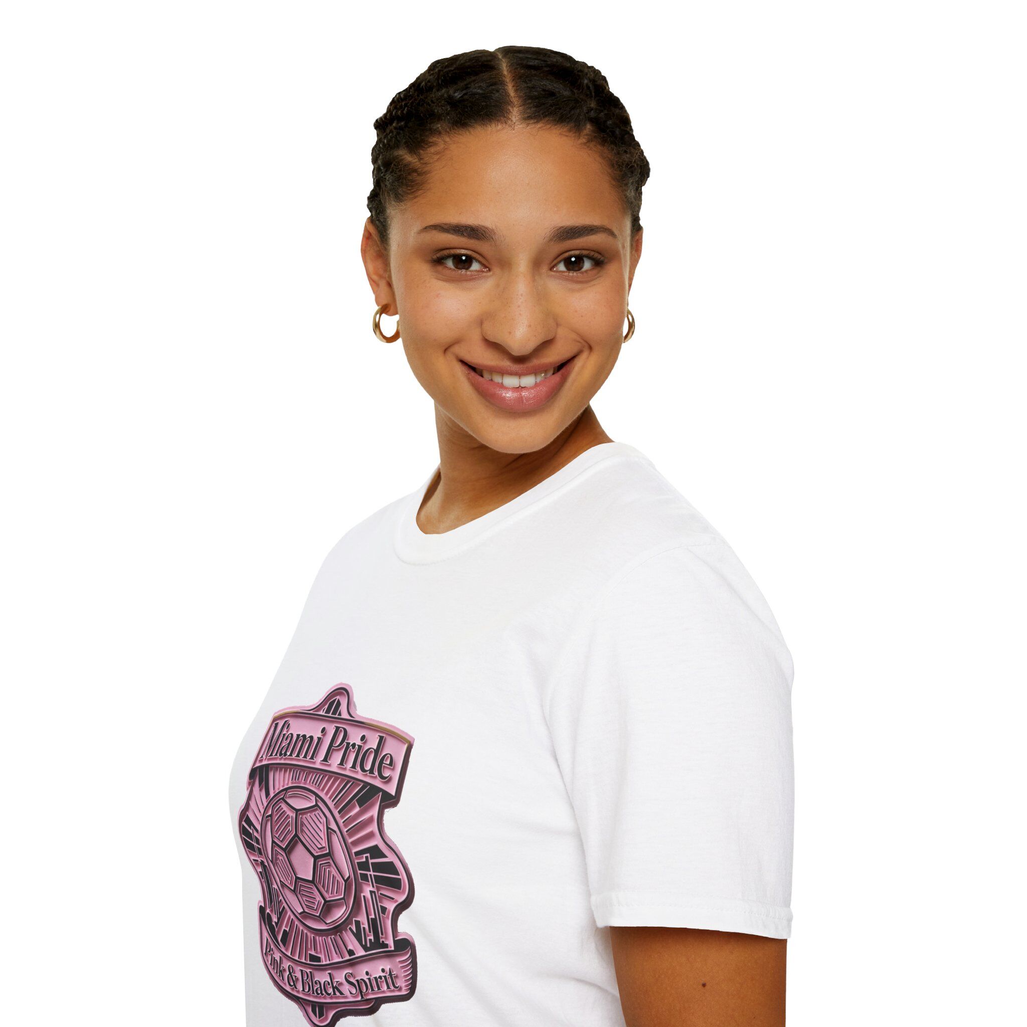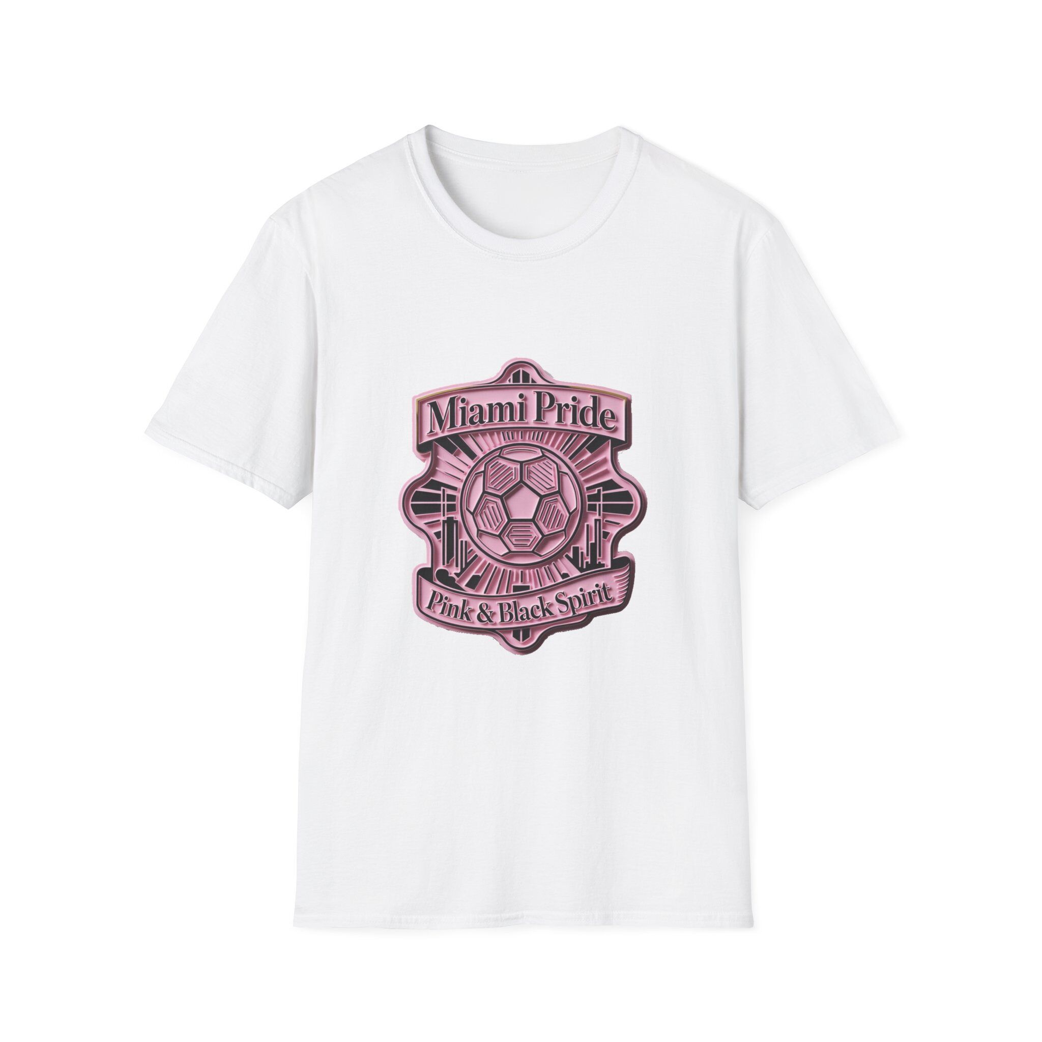 This softstyle tee wears like a lived-in favorite from the first try. Lightweight, breathable 100% ring-spun cotton (white) with a classic crew neck and clean, timeless fit—designed to carry a bold, pink-and-black soccer crest that reads “Miami Pride” and “Pink & Black Spirit.” The emblem sits centered on the chest with crisp DTF/DTG printing for sharp lines and lasting color. Subtle details like a pearlized tear-away label, ribbed collar, and shoulder tape keep the shirt comfortable and shape-retentive, whether you’re cheering from the stands or strolling the boardwalk. Ethically sourced cotton and Oeko-Tex certification mean it’s not just soft—it's responsibly made.
