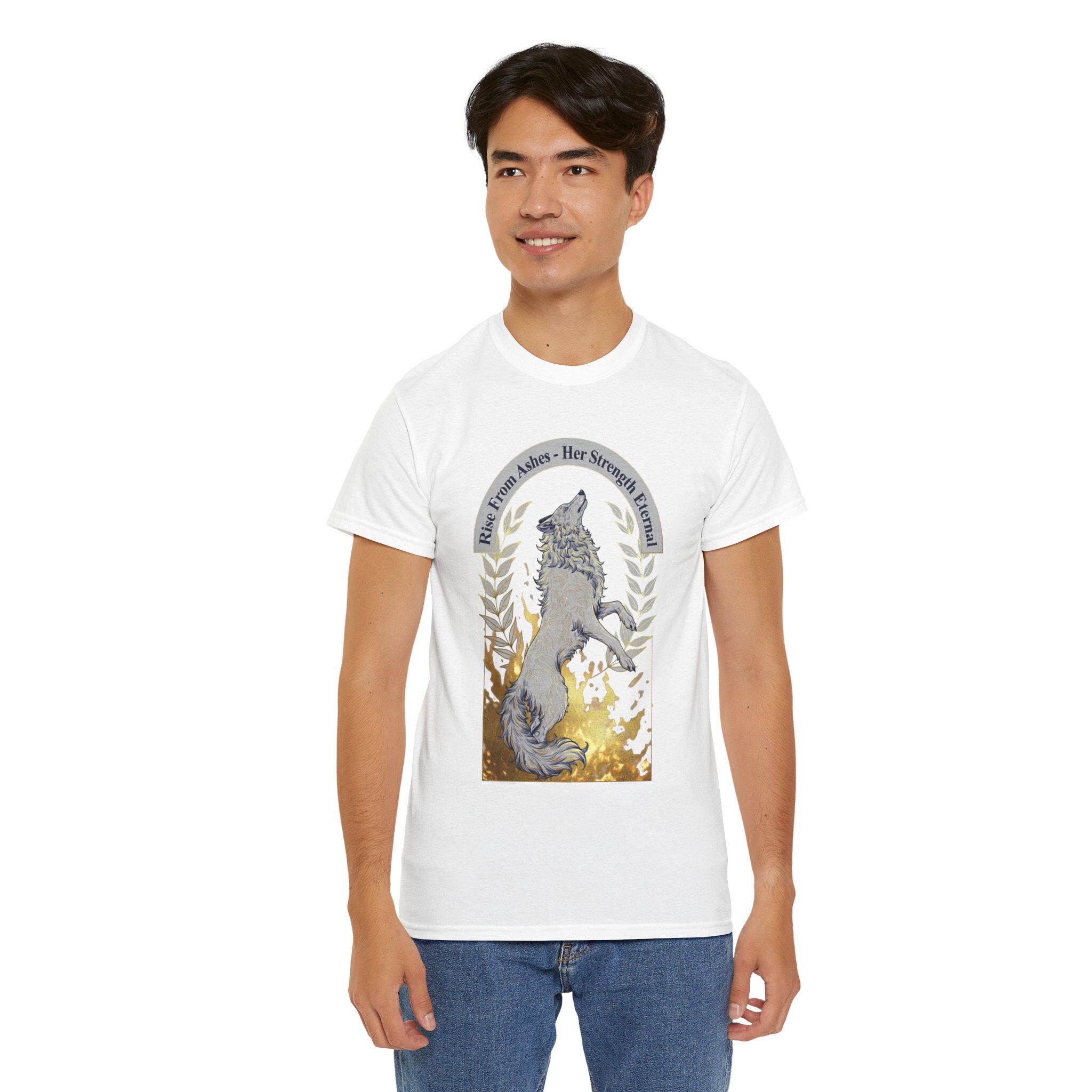 This classic cotton tee carries a quiet, wild spirit — a hand-drawn fox rises amid warm ochre brushstrokes and laurel sprigs, framed by a soft arched banner. It feels like a slow morning on the edge of the woods: sun through trees, crisp air, and a moment to stand still and listen. Wear it on trail days, cozy cabin weekends, or when you want a low-key statement that reads as thoughtful and nature-minded. The lightweight, breathable cotton keeps the design clear and comfortable, while the crew neck and relaxed silhouette let you layer it under a jacket or wear it solo with jeans. Subtle distressing in the print gives a lived-in, artisan look that complements rustic wardrobes and slow-fashion sensibilities.