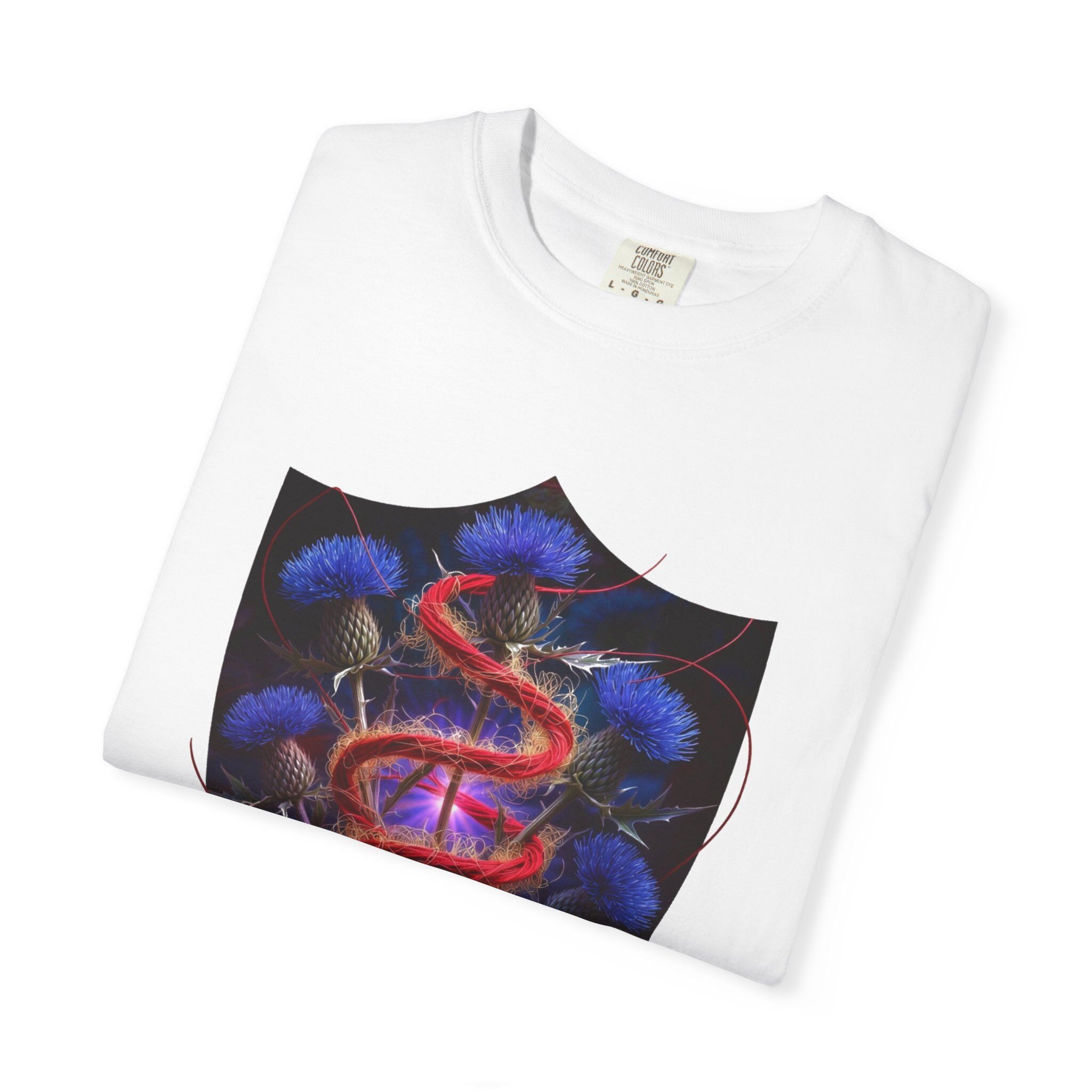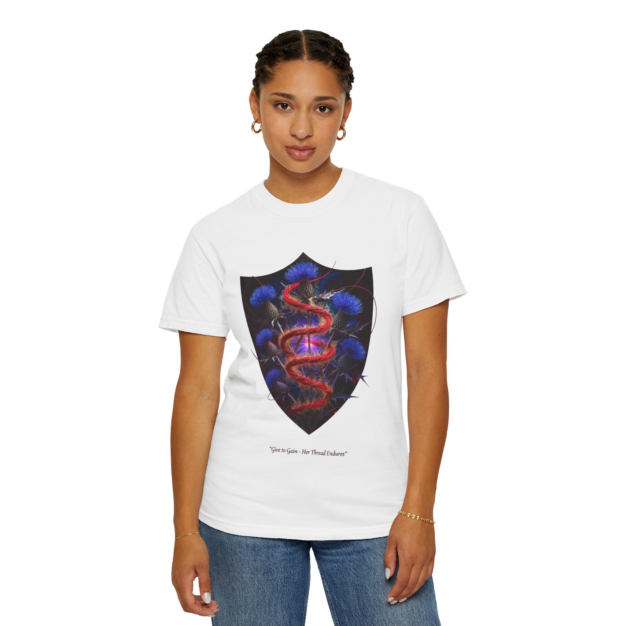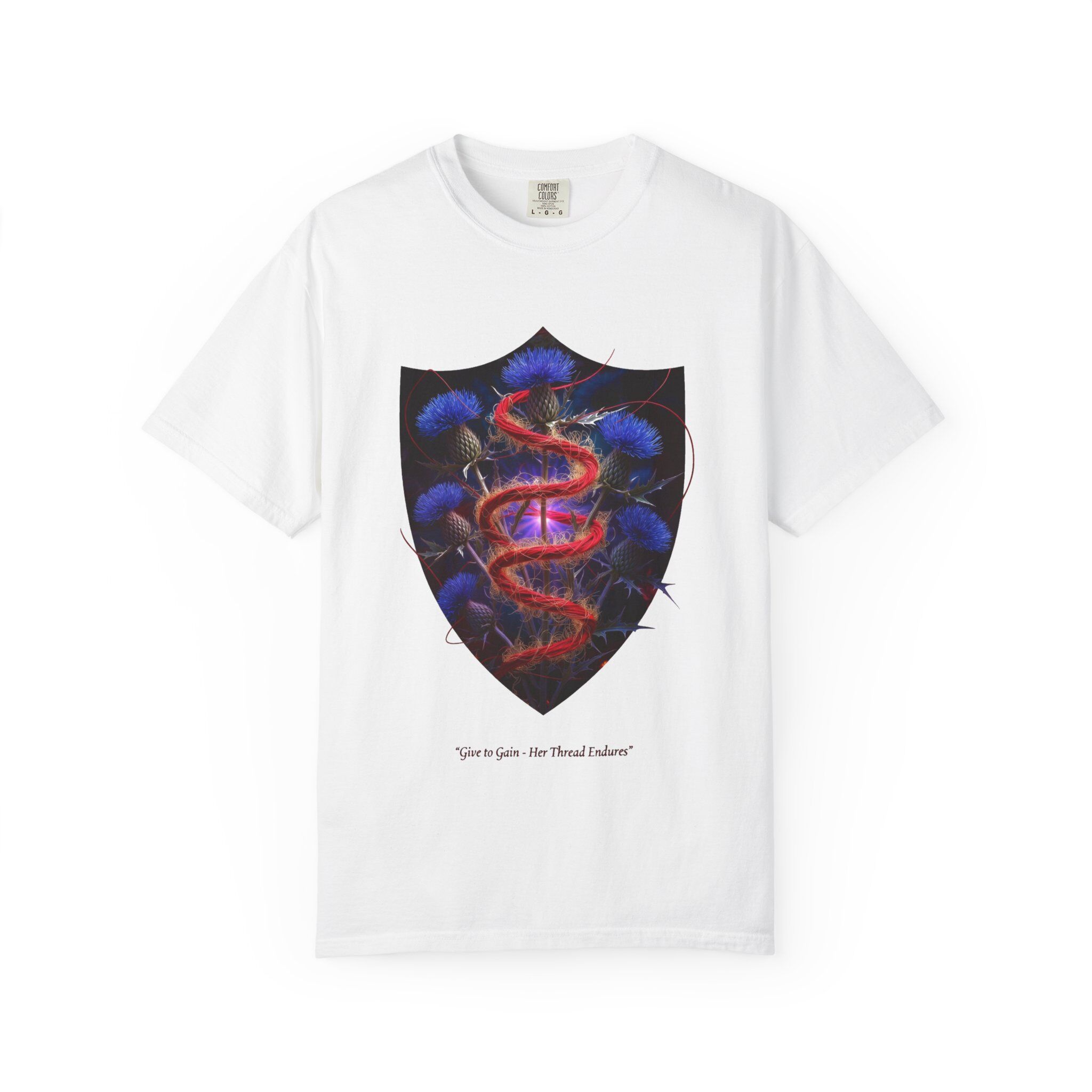 A heavyweight, garment-dyed tee with a modern fantasy crest printed on the chest. The shield-shaped artwork frames a sinuous red serpent weaving through luminous blue thistles, giving the shirt a moody, storybook feel. The cotton fabric is soft from post-construction dyeing, and the relaxed cut sits comfortably for everyday wear. Wear it with worn denim or layered under a jacket for nights out, gallery openings, or low-key meetups where subtle, art-forward style speaks louder than logos.