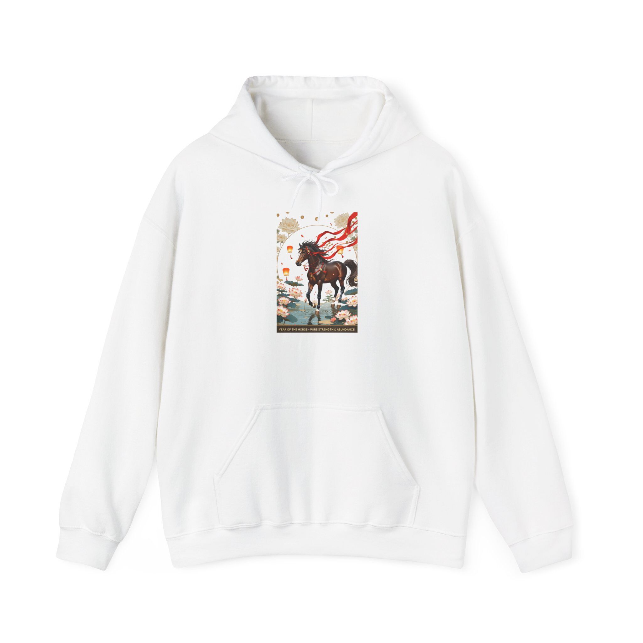 Lunar New Year Year of the Horse lotus design: graceful horse in blooming ponds with lanterns, peonies, and “Pure Strength & Abundance.” Ideal global gift for USA, UK, Canada, Australia, Saudi Arabia – red gold tees, mugs & more.